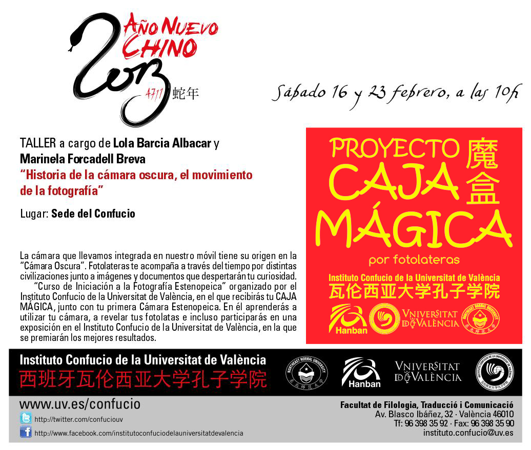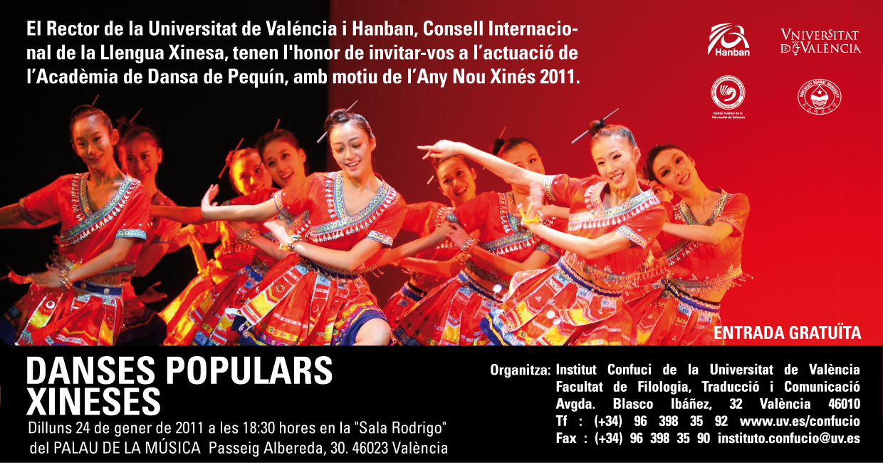OBERTA LA MATRICULA DELS CURSOS i HORARIS del 2on SEMESTRE 2010/11 POTS DISFRUTAR DEL VIDEO del gran espectacle de "DANSES POPULARS XINESES" celebrat el día 24 de gener a les 18:30 h. al Palau de la Música de Valencia. video del matí per a escolars (10:30 am) video de la vesprada (18:30 pm) VIDEO CURT PROMOCIONAL DE L'ESPECTACLE Dimecres, 2 de febrer de 2011 Jardí Botànic Celebració de l'Any Nou Xinés Sopar d'Any Nou Xinés, dimecres 2 de febrer a les 21:00 hores.