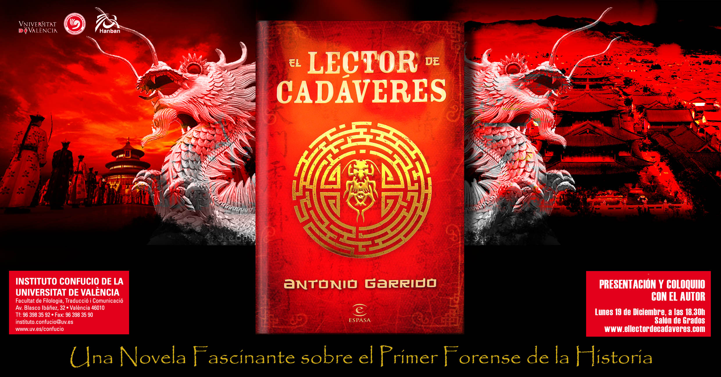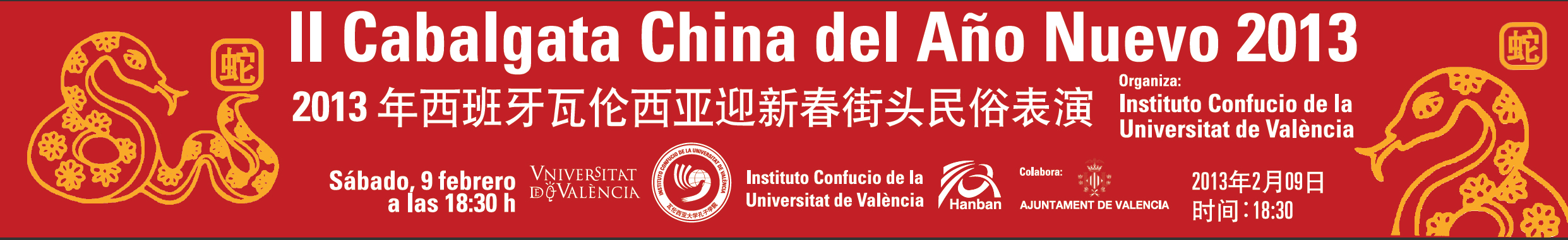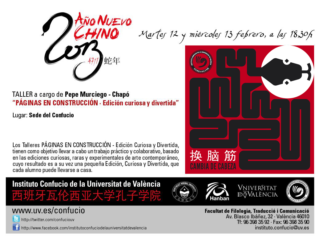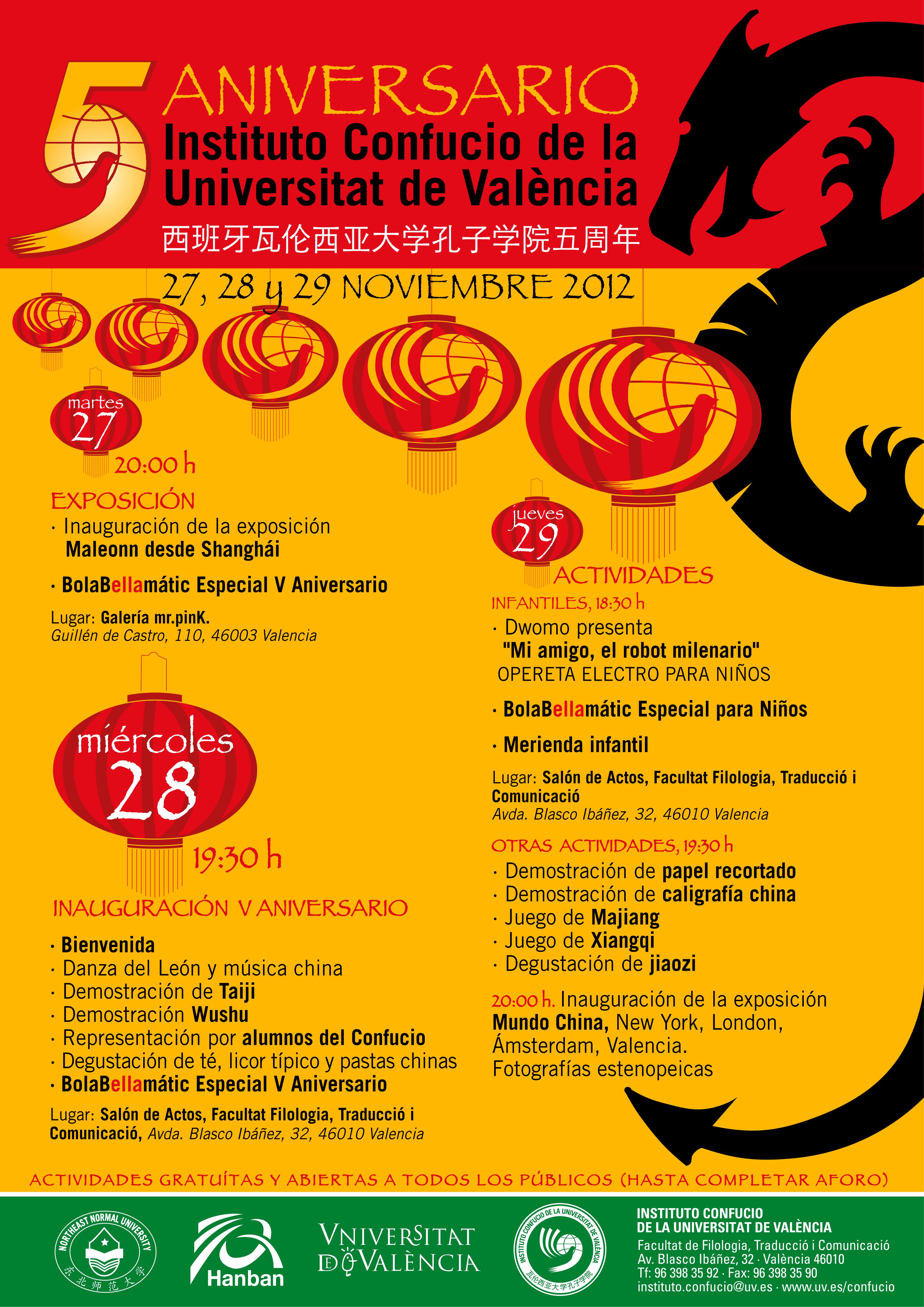 18:30 h. ![]() Dimecres, 25 de gener Palau de Congressos de Valencia Avda Corts Valencianes 18:30 pm. Gran espectacle "Danses Tradicionals Xineses" Entrada gratuita (fins a completar l'aforament) ![]() Feliç Any Nou del Drac 2012 ![]() Dijous, 26 de gener Exposició de Manuel Olías a l'Institut Confuci ![]() I Cavalcada xinesa de València (al carrer Pelayo, junt a RENFE) Dilluns 23 de gener a les 18:30pm ![]() Cel.lebració de l'Any Nou Xinés 2012 ![]() Sopar d'Any Nou Xinés. Compra els tickets a l'Institut Confuci ![]() Exposició de "Huang Xu Tong i Yang Hong Li". Dimecres 21 de desembre de 2011. 20:00 h. Lloc: Sala Color Elefante, Carrer Sevilla, 24 Valencia (Barri Russafa). Organitzada per la Sala Color Elefante i l'Institut Confuci de la Universitat de València ![]() Conferencia: "¿Dominará China el Mundo en el Siglo XXI? La Política Exterior de una Potencia Ascendente", impartida por Javier de la Puerta. Dimarts, 20 de desembre a les 19:00 h. Saló de Graus, Facultat de Filologia, Traducció i Comunicació ![]() Presentació del llibre "El Lector de cadáveres" de Antonio Garrido Thriller sobre el primer forense de la història Dilluns, 19 de desembre, 18:30 h. Saló de Graus de la Facultat de Filologia, Traducció i Comunicació ![]() Conferència: "Poesia i món en la Xina antiga" impartida pel Professor Antonio Méndez Rubio. Dilluns 12 de desembre de 2011, a les 20:00 h. Organitzada per l'Aula de Poesia i l'Institut Confuci de la Universitat de València ![]() 4rt Aniversari Inauguració Institut Confuci de la Universitat de València Dilluns, 28 de novembre de 2011 Saló d'Actes, Facultat de Filologia, Traducció i Comunicació 18:30 h. (Ball del Lleó, té i pastes xineses, actuacions còmiques, rei de les màscares i moltes més actuacions)