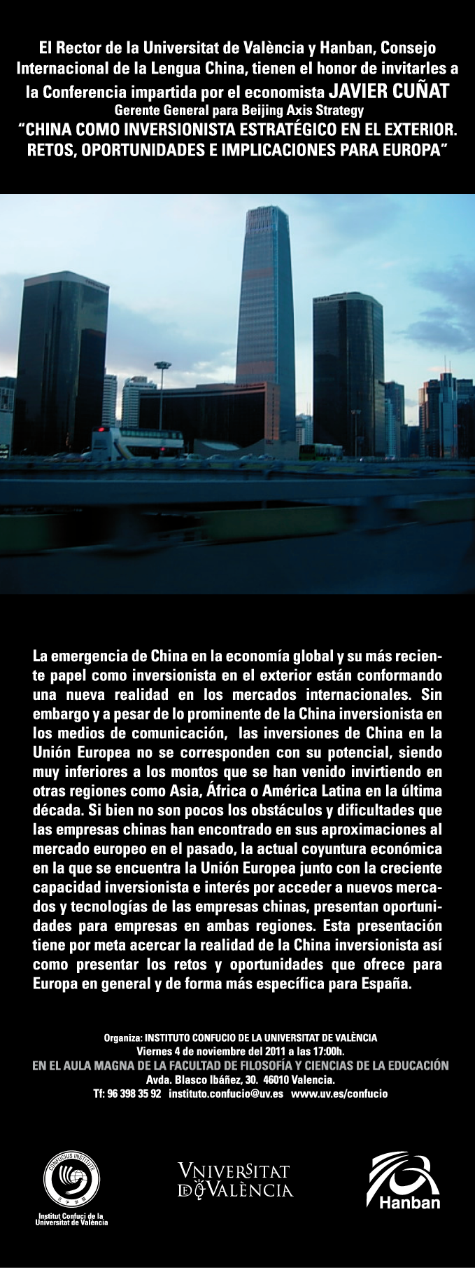 MATRÍCULA CURS 2011-2012 "China como inversionista estratégico en el exterior: retos, oportunidades e implicaciones para Europa" Conferencia impartida por el economista Javier Cuñat Viernes, 4 de noviembre a las 17:00 h. Aula Magna, 1er piso. Facultat de Filosofía y CC. Educación, Avda Blasco Ibañez, 30