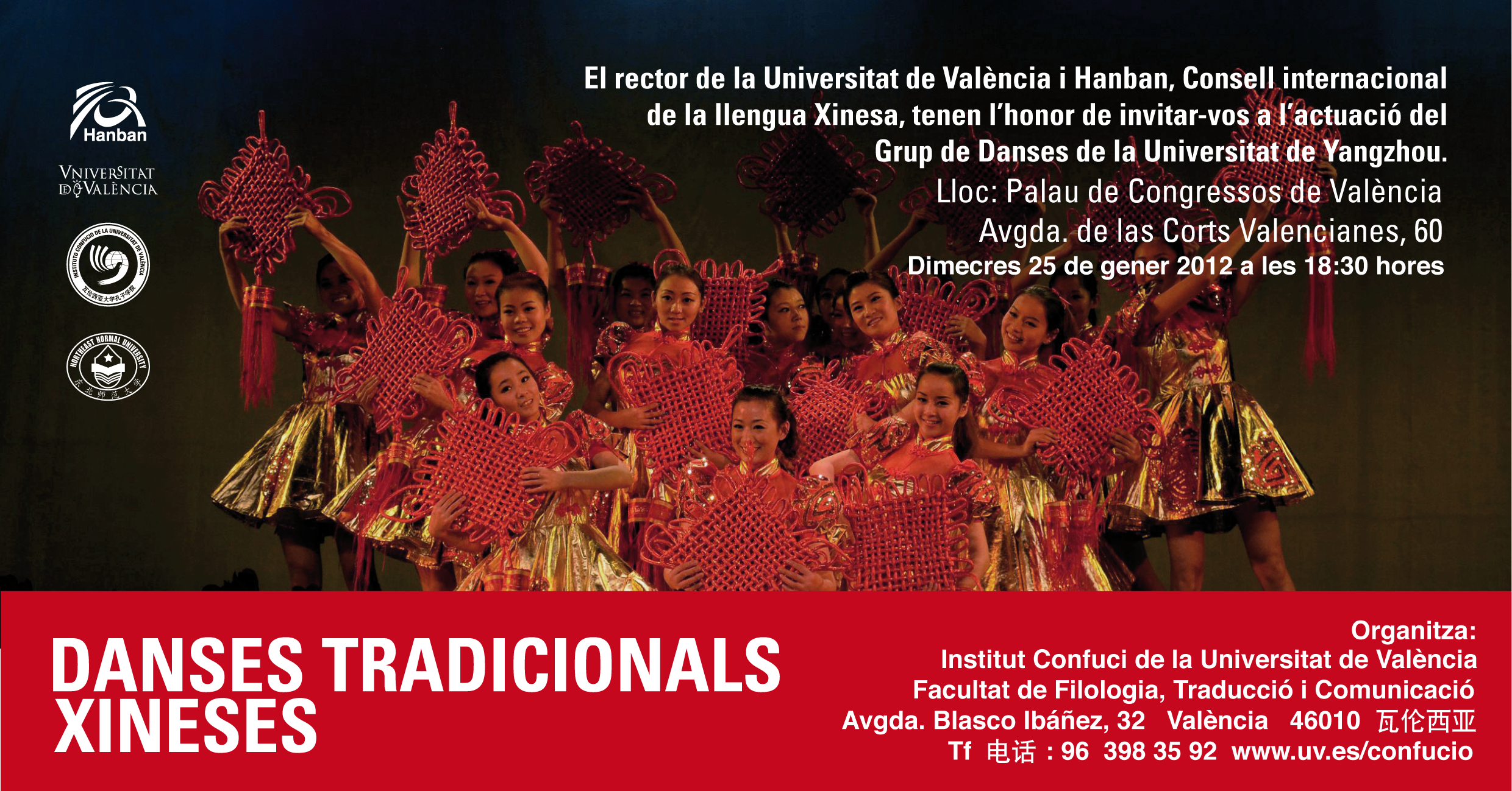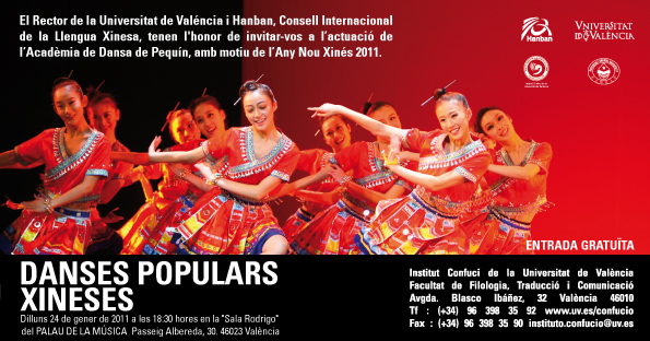 INVITACIÓ al gran espectacle de "DANSES POPULARS XINESES" el día 24 de gener a les 18:30 h. al Palau de la Música de Valencia. Entrada gratuïta. Taquilla oberta 1 hora abans fins completar aforament. VIDEO CURT PROMOCIONAL DE L'ESPECTACLE Actuació especial per a escolars: "DANSES POPULARS XINESES" el dilluns, 24 de gener a les 10:30 h. al Palau de la Música de Valencia. Cridar per reservar. Invitacions fins completar aforament.