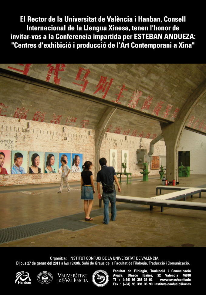 CONFERÈNCIA: Dijous 27 de gener, a les 19:00 hores. "Centres d'exhibició i producció d'art contemporani a Xina", impartida per Esteban Andueza, comisari d'art amb gran experiència amb galeries a la Xina.