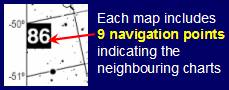 The TriAtlas included navigating aids to jump to the neighboring charts sets at higher magnifications. The chart number was at the lower right area (large outline font). Each chart included nine navigating points giving the chart number of the nearest neighboring charts within the same set, indicated in a bold font in the borders (the corners and in the middle sides). There were also smaller outline numbers in the A-charts indicating the location of the included B- and C- charts, and similar numbers in the B-charts to jump to the C-charts. It was very easy to move around a given area, even at high magnification, and swap between sets. Constellation lines were marked in all sets to make the identification in the sky even easier.
