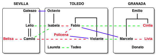 En esta página se explican los sucesos acaecidos antes de que empiece la obra y que se van revelando paulatinamente a lo largo de la comedia. El esquema siguiente contiene los personajes. Los que están en rojo se mencionan, pero no aparecen en escena. La última línea corresponde a los criados. Las líneas verdes indican relaciones sentimentales que finalmente prosperan, mientras que las rojas son relaciones unilaterales o ficticias que finalmente fracasan. Las líneas azules indican amistad.
