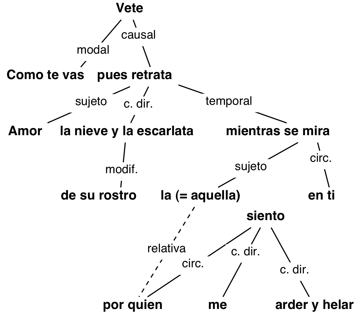 quien helar y arder me siento, mientras en ti se mira, Amor retrata de su rostro la nieve y la escarlata en tu tranquilo y blando movimiento, |
