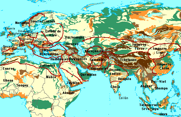 Entre la India y China estaba también el Tíbet, también de cultura budista, cuyos tiempos belicosos habían pasado ya. Al norte, los turcos estaban convirtiéndose al islam y ya habían formado dos Estados islámicos poderosos: el de los gaznawíes y el de los karajaníes. Por otra parte, mercenarios turcos habían acaparado mucho poder en distintas partes de los disgregados dominios islámicos. El Estado islámico más extenso era el Califato Fatimí. El califa al-Hakim era un fanático que persiguió encarnizadamente a los cristianos, en particular a los coptos de Egipto. Al sur sobrevivía aún el reino cristiano de Aksum. Durante mucho tiempo tuvo que replegarse hacia el sur, lejos de la costa del mar Rojo, ocupada por los musulmanes, pero recientemente había ganado de nuevo la costa.