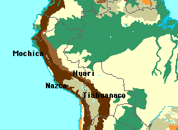 Los mochicas habían coexistido con los nazcas, un pueblo pacífico que vivía en pequeñas aldeas dedicado a la agricultura y el pastoreo y en el que no se advierten signos de grandes señores poderosos. Habían sido grandes tejedores que dominaban el bordado, la tapicería, el brocado, las gasas, el punto de aguja, etc. Pero lo más destacado de esta cultura son dos extrañas construcciones: una es un monumento consistente en largas hileras de troncos durísimos hincados en el suelo formando grupos, y otra es una red de líneas y figuras de animales trazadas en el suelo por medio de piedrecillas y que forman imágenes de tal tamaño que sólo pueden ser apreciadas desde aviones. No se conoce su finalidad, y no ha faltado quien pretendiera ver en ellas un campo de aterrizaje para naves extraterrestres.