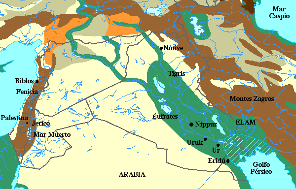 Mientras tanto, el resto de la media luna fértil se alimentaba de la cultura sumeria. Al este de la Baja Mesopotamia, al sur de los montes Zagros, en el actual Irán, se formó un pueblo conocido como Elam, que prosperó con el control del comercio entre Irán y Mesopotamia. Los elamitas adoptaron la cultura sumeria, pero conservaron su propia lengua, que subsistió hasta el siglo XI d.C.