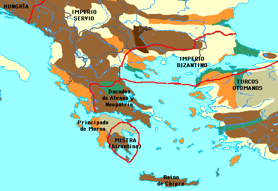 El emperador Juan VI reorganizó el Imperio Bizantino. Lo dividió en tres regiones: Tracia (que incluía Constantinopla), Tesalónica y Mistra. Envió a Mistra como déspota a su hijo Manuel.