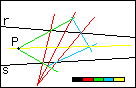Así, lo que hemos hecho para resolver el problema es construir dos triángulos que tengan un lado sobre cada una de las rectas dadas y con un centro de perspectiva (el punto de donde parten las rectas rojas). Las prolongaciones de los lados se cortan en P, en el punto de corte inaccesible de las rectas dadas y en un tercer punto que, si elegimos con cuidado lo que podemos elegir, queda dentro de la hoja, y nos permite trazar la recta que buscamos, que no es sino el eje de perspectiva de los triángulos.