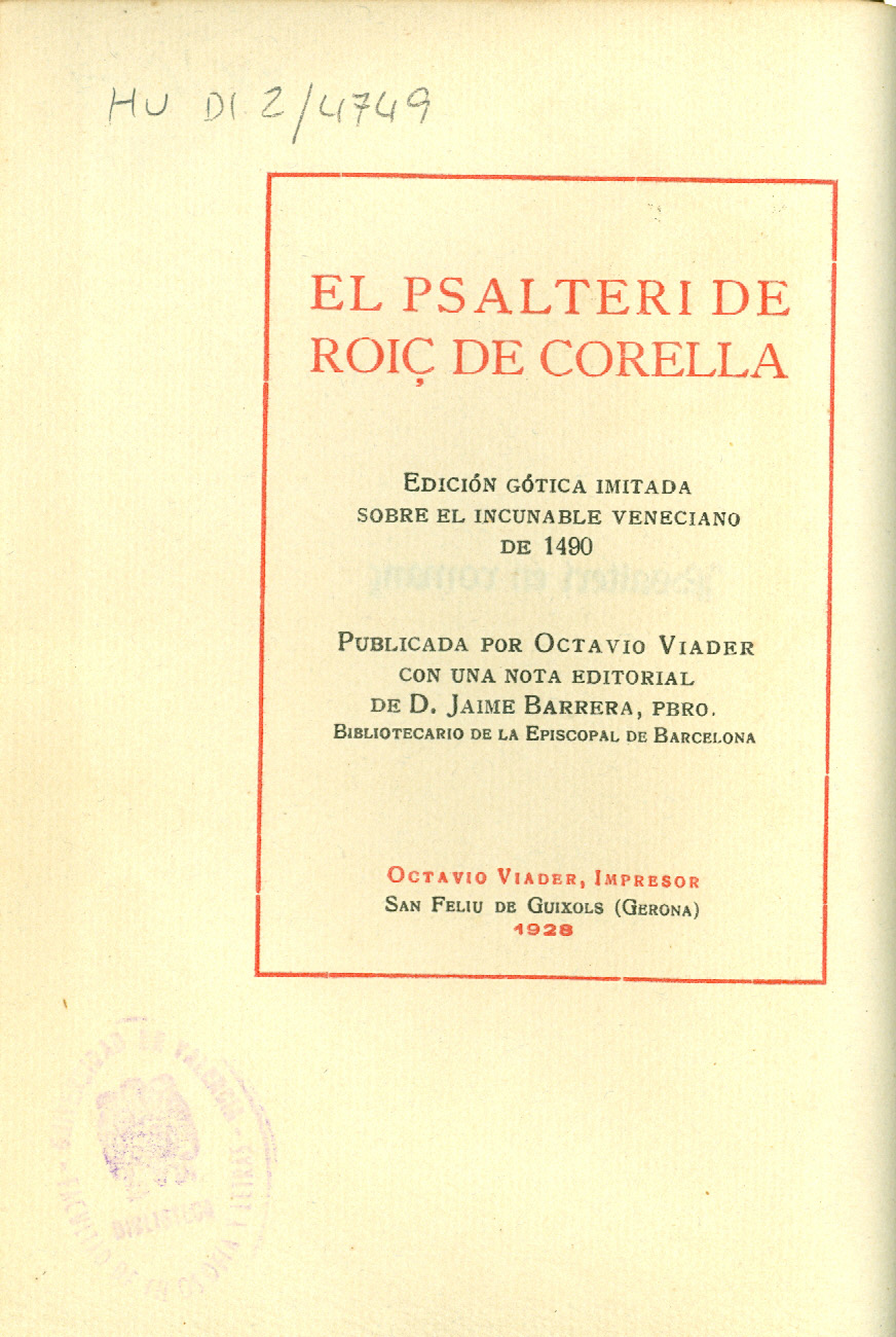El texto facsimilar de El Psalteri contiene la reproducción de un gravado del rey David arrodillado junto a su arpa mientras un ángel desde las alturas le lanza una flecha. El texto está impreso a tres tintas. Roís de Corella acompañó el texto con un índice en latín precedido del ordinal en romanos, todo en tinta roja, debajo del mismo aparece la traducción en tinta negra. Al final del libro se adjunta el estudio sobre él mismo de Jaime Barrera. Ahora bien, lo que más resalta de esta edición es su encuadernación realizada en piel grabada, con motivo central en forma de losange que contiene el nombre del autor y el título en letras de oro en la cubierta y el escudo de Sant Feliu de Guíxols en la contracubierta. A su vez, este motivo está rodeado por semicírculos y enmarcado en un fondo grabado en receptáculos con cruces de Florencia y enmarcados en un rectángulo en inglete. Los mismos motivos destacan en el lomo con el nombre del autor y el título en la parte superior y Viader de San[sic] Feliu 1920[sic] en la parte inferior.