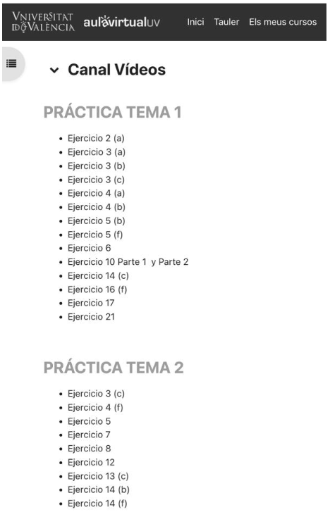 Tras la presentación en clase, los alumnos procedían a grabar su vídeo y lo remitían al profesorado para su revisión, con el fin de mejorar la calidad de las grabaciones, la claridad expositiva y la eficiencia en la resolución. Los vídeos revisados se incorporaban al canal de videotutoriales en el Aula Virtual de la asignatura, como se muestra en la Figura 1.