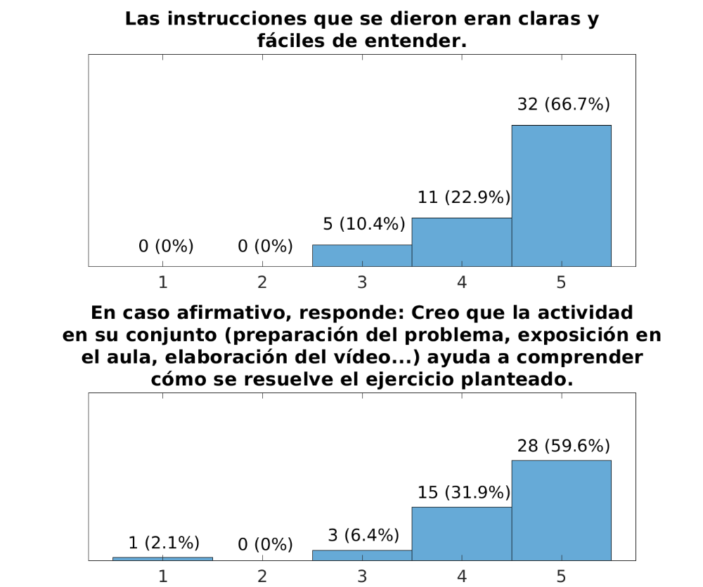 Las encuestas evidencian una percepción predominantemente favorable de la iniciativa de crear videotutoriales para la asignatura, tal como se muestra en la Figura 2. Para la evaluación, se utilizó una escala de Likert de cinco puntos: (1) Muy en desacuerdo, (2) En desacuerdo, (3) Indiferente, (4) De acuerdo, (5) Muy de acuerdo. Esta escala permitió a los participantes expresar su grado de conformidad con diversas afirmaciones sobre la experiencia, proporcionando una visión detallada de la recepción del proyecto por parte del alumnado. Los resultados de la encuesta indican una recepción muy favorable de la actividad por parte del alumnado: La claridad y sencillez de las instrucciones recibieron una valoración altamente positiva. Igualmente, el conjunto de la actividad, que abarcaba la preparación del problema, su exposición en clase y la creación del videotutorial, fue bien acogido por los estudiantes. Una amplia mayoría, el 91,5% de los encuestados, consideró que la actividad contribuye significativamente a la comprensión de los métodos de resolución de los ejercicios propuestos. Además, el 87,5% de los participantes recomendaría la continuidad de esta actividad en futuras ediciones del curso, lo que refleja su percepción del valor educativo de la experiencia.