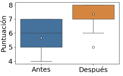Para evaluar la diferencia en la competencia en pensamiento computacional antes y después de la formación, se realizó un test de Wilcoxon para muestras emparejadas. Los resultados muestran una diferencia estadísticamente significativa entre las notas medias obtenidas antes y después de la formación (W=18, p=1e-5), lo que sugiere una mejora significativa en la competencia en PC del alumnado. Sin embargo, hay que tener en cuenta que los cuestionarios utilizados no habían sido validados, por lo que los resultados obtenidos deben considerarse preliminares y se requiere un estudio más profundo.