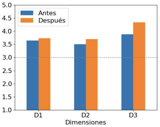 En la Figura 2 se presentan los resultados del cuestionario sobre actitud hacia la informática [8]. Se muestran las puntuaciones medias en las tres dimensiones consideradas: confort (D1), interés (D2) y utilidad para las clases (D3), en una escala de 1 a 5 correspondiente a la escala Likert de 5 puntos del cuestionario.