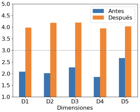 Los resultados indican que la actitud hacia la informática era inicialmente positiva (por encima de 3) y que ha mejorado ligeramente tras la formación, en especial la valoración de la utilidad para las futuras clases como docentes. Sin embargo, la formación no parece haber provocado una mejora significativa en estas actitudes. Los resultados relativos a la percepción de la competencia adquirida se presentan en la Figura 3, donde se muestran las puntuaciones medias para cada una de las dimensiones del cuestionario [1] antes y después de la formación. Las dimensiones evaluadas son: