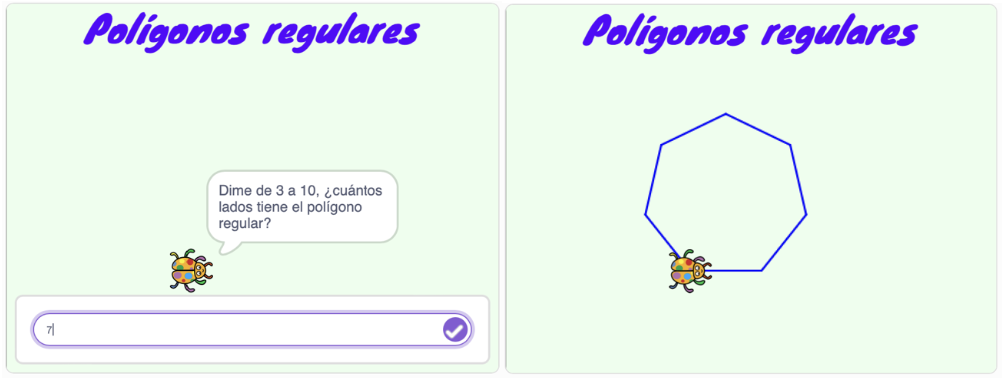 Se llevó a cabo una sesión introductoria sobre el lenguaje de programación Scratch [5], diseñada para familiarizar al alumnado con su entorno de desarrollo y funcionalidades básicas. Durante esta sesión, se propuso como actividad principal la creación de un programa capaz de dibujar polígonos regulares. El aprendizaje se estructuró de forma progresiva: primero creando un programa para dibujar un cuadrado y su optimización utilizando una instrucción de repetición. Posteriormente, investigando los cambios necesarios para dibujar un pentágono, seguido de la generalización para N lados. El programa final debía recibir el número de lados como parámetro de entrada y dibujar el polígono regular correspondiente. En el anexo 1 se muestran imágenes de la ejecución de la aplicación “Polígonos regulares”.