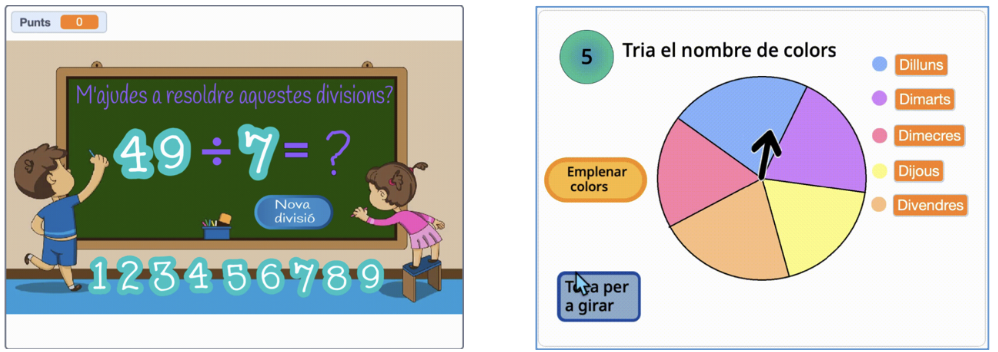 A continuación, se presentan las imágenes de dos de los recursos educativos digitales creados por el alumnado utilizando Scratch: “El juego de las divisiones” y “Ruleta”.