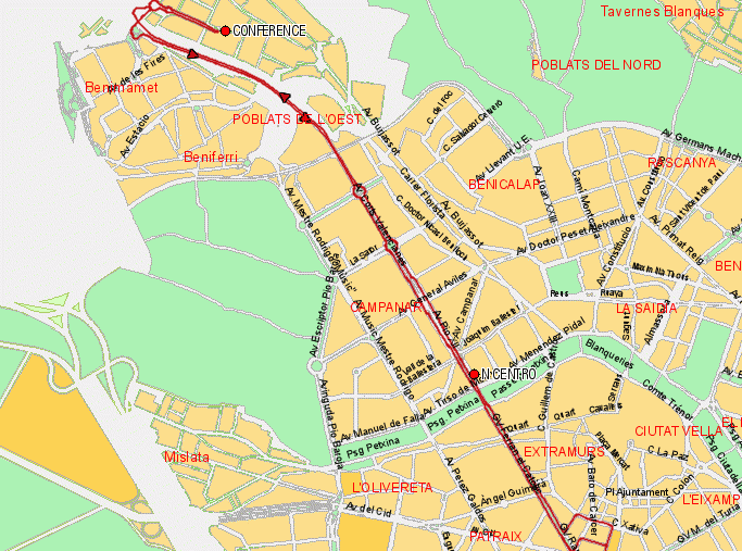 The alterenative way of getting to the conference is to take the tram in dowtown and to get off at Vicent Andrés Estellés stop. Tram corresponds to metro line 4 and more information can be found here. You can find a pdf map of the metro lines here. The nearest stop to Valencia's old town is "Pont de Fusta". From there, you should take the direction "Mas del Rosari - Feria Valencia - Ll. Llarga - Terramelar".