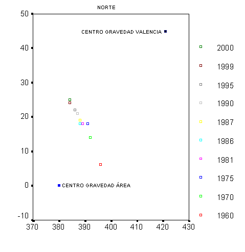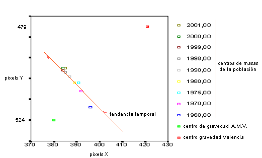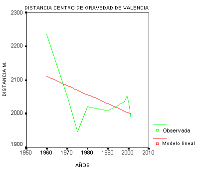 En el gráfico puede comprobarse el ajuste de los valores de los centros de masas a la recta de tendencia. Se podría hablar como hemos dicho de una tendencia clara de movilidad noroeste , lo que produce un alejamiento del centro de gravedad general del área. El hecho de acercamiento al centro de Valencia parece motivado precisamente por la situación de dicho punto en un lugar más al norte.