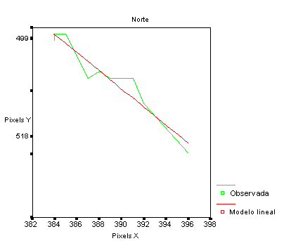 La relación entre abcisas y ordenadas de los centros de masas sigue un modelo lineal de tendencia claramente noroeste. Dado que temporalmente el primer par de valores es el inferior