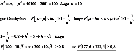 I -1 Una variable aleatoria con distribución desconocida tiene de media 200 y de momento ordinario de orden dos 40100. ¿Entre qué valores se encontrarán al menos el 80% de las observaciones posibles de la variable?
