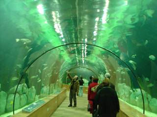 rooms with aquariums communicated by large tunnel-like corridors, one of