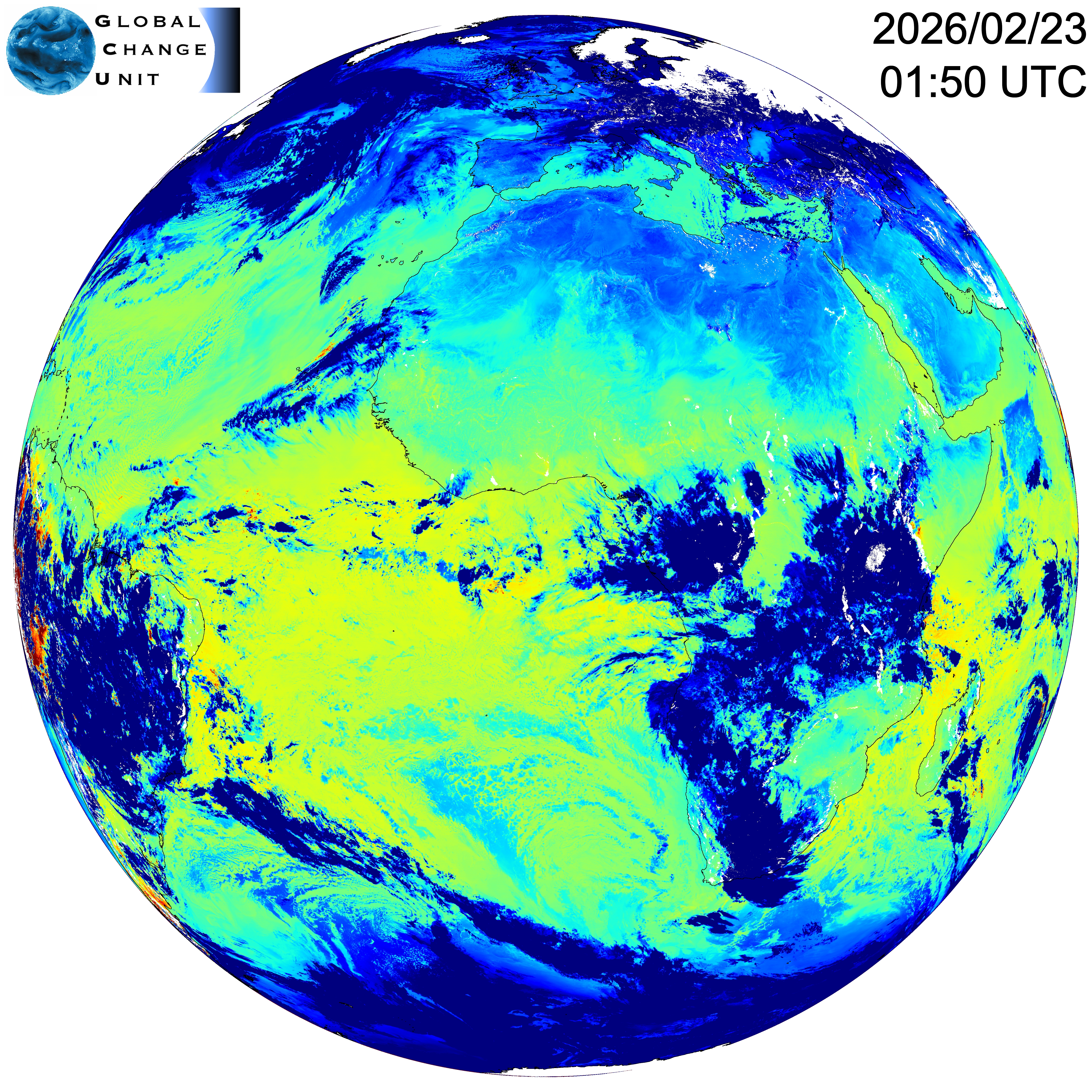 This map shows the most recent values of SLST (Sea and Land Surface Temperature) for MTG FCI full disk. Low temperatures (blue) are associated to clouds, while high values (red) are observed in deserts.