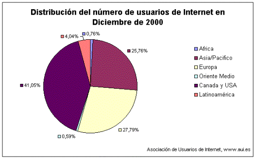En los dos casos se acentúan los rasgos positivos del uso de la nuevas tecnologías, reflejando un tipo de discurso reduccionista, como señala Imanol Zubero1. Y más aún en el primero su potencialidad se convierte en certeza presente, puesto que “todos los rincones del planeta” son en realidad pocos lugares. Según el PNUD (Programa de Naciones Unidas para el desarrollo) el número de usuarios de Intenet en el mundo no alcanza el 5 % de la población total y como nos señala el gráfico que ofrece las Asociación de Usuarios de Internet (www.aui.es) su distribución es muy irregular, concentrándose en EE.UU, Canadá, Europa y Japón.