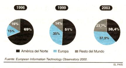 A pesar de las reducidas dimensiones de esta aldea global los medios de comunicación transmiten a sus ciudadanos el mensaje de que si no están conectados a la red, no existen, y fomentan la necesidad de consumir “tecnología”, favoreciendo las reglas de la expansión capitalista. En el caso de Europa se aprecia además cómo se provoca un sentimiento de competencia frente a EE.UU. En El País (9 de marzo de 2000) encontramos el siguiente titular: “Europa igualará a EE.UU. en número de abonados a Internet en el año 2002. Un estudio sitúa al Viejo Continente en “el centro de expansión” del comercio electrónico.” Y en el texto de la noticia: “El dinamismo que muestran las empresas europeas en todo lo relacionado con el comercio electrónico e Internet se debe a la necesidad de competir globalmente con las grandes compañías estadounidenses y asiáticas y a la búsqueda de mayor eficiencia dentro de las propias organizaciones.” En el artículo se presentaban las conclusiones de un estudio del Observatorio Europeo de las Tecnologías de la Información (EITO) junto a los siguientes gráficos, que favorecen la confrontación Europa-América del Norte (seguramente excluyendo a México).
