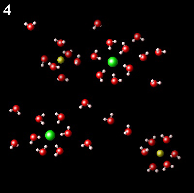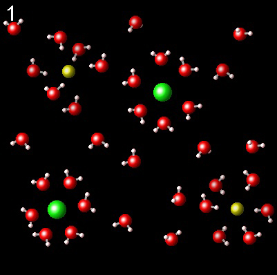 The following figures represent NaCl solution in water and the interaction of the molecules of the solvent, water, with Na+ (yellow) and Cl-(green) ions.