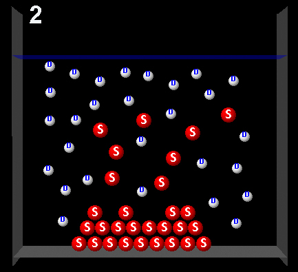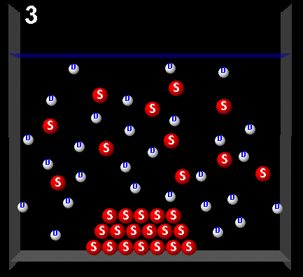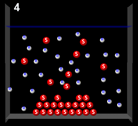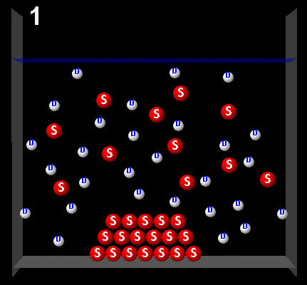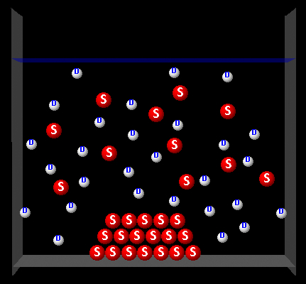 The following figure represents a solute (S, red) partially dissolved in a solvent (D, white).