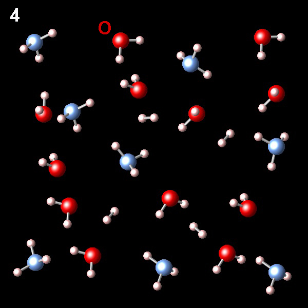 Examines in detail the following figures where red, white and blue spheres represent atoms of oxygen, hydrogen and nitrogen respectively.