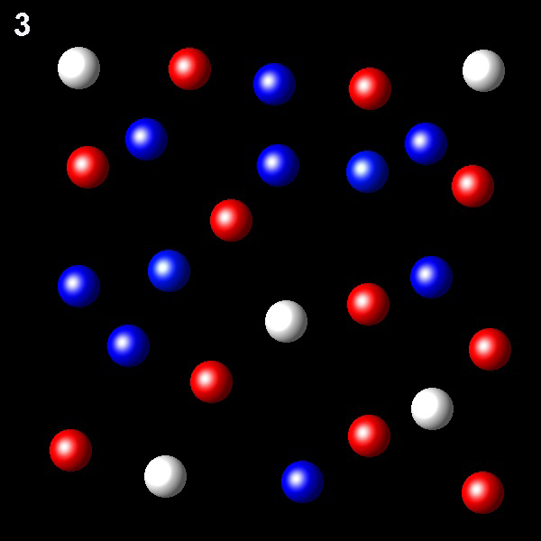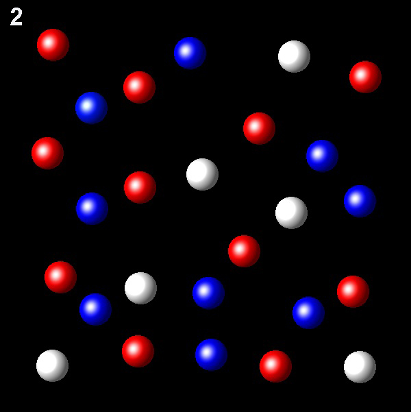 Particles corresponding to three gaseous substances A, B and C, are shown as white, red and blue balls respectively. The following figures show representative portions of the three gaseous substances occupying the same volume at the same temperature.