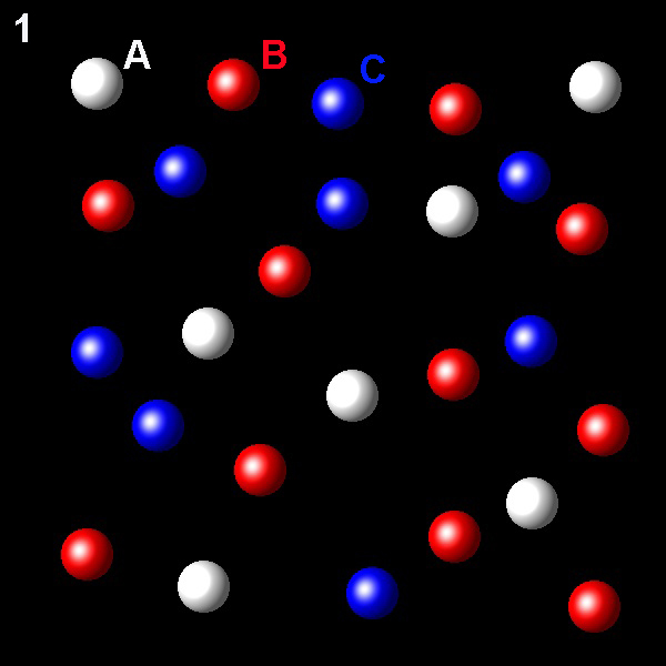 Particles corresponding to three gaseous substances A, B and C, are represented by white, red and blue balls respectively. The following figures show representative portions of the three gaseous substances occupying the same volume and the same temperature.