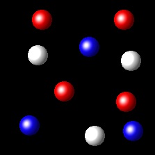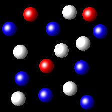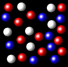 Particles corresponding to three gaseous substances are represented by white, blue and red balls. The following figures show representative portions of the three gaseous substances, all occupying the same volume and the same temperature.