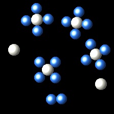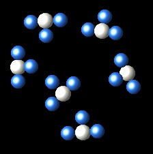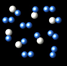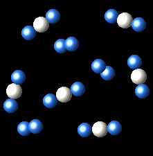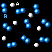 In the following representation we see a vessel containing a gas A (white spheres) and gas B (blue spheres).