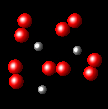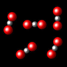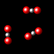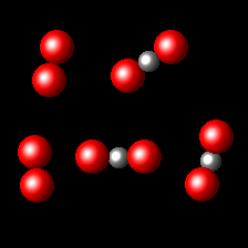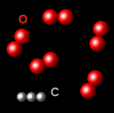 The figure below shows the initial state of a mixture of carbon (gray) and oxygen (red) before reacting