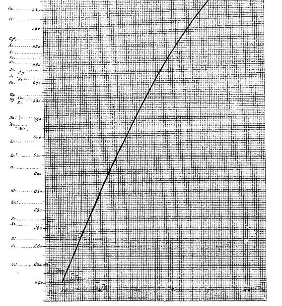 Esquema de funcionamiento del espectroscopio. El espectroscopio consta de tres brazos, el de la derecha es el objetivo [L] y el de la izquierda [M] es el que conduce la luz emitida por la muestra hasta el prisma [abc] que produce la separación de los diversos colores. El tercer brazo, situado en el centro de la figura [m-n] contiene una escala graduada sobre vidrio, colocada de tal modo que su imagen se refleja sobre una de las caras del prisma [abc] del espectroscopio y se dirige hacia el objetivo [L]. De este modo, en el objetivo aparecen superpuestas dos imágenes, la escala graduada y la procedente de la muestra con las líneas espectrales características de la sustancia. Por ello, resulta posible calibrar el instrumento mediante líneas producidas por sustancias cuyo espectro es conocido. Utilizando varias sustancias de este tipo, se puede establecer una gráfica que relaciona la longitud de onda de la radiación emitida con la escala de la regla graduada del espectroscopio correspondiente. El brazo que recoge la luz de la muestra [M] contiene una rendija variable y un prisma, con lo que se pueden comparar simultáneamente la luz de dos muestras diferentes, de acuerdo con el esquema de la gráfica adjunta. |