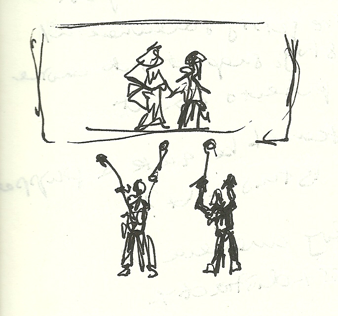 Vous avez dessiné le décor de la scène en faisant attention aux objets (attrezo). Vous avez dessiné au moins trois personnages ou trois possibilités pour deux personnages. (4 dessins) |