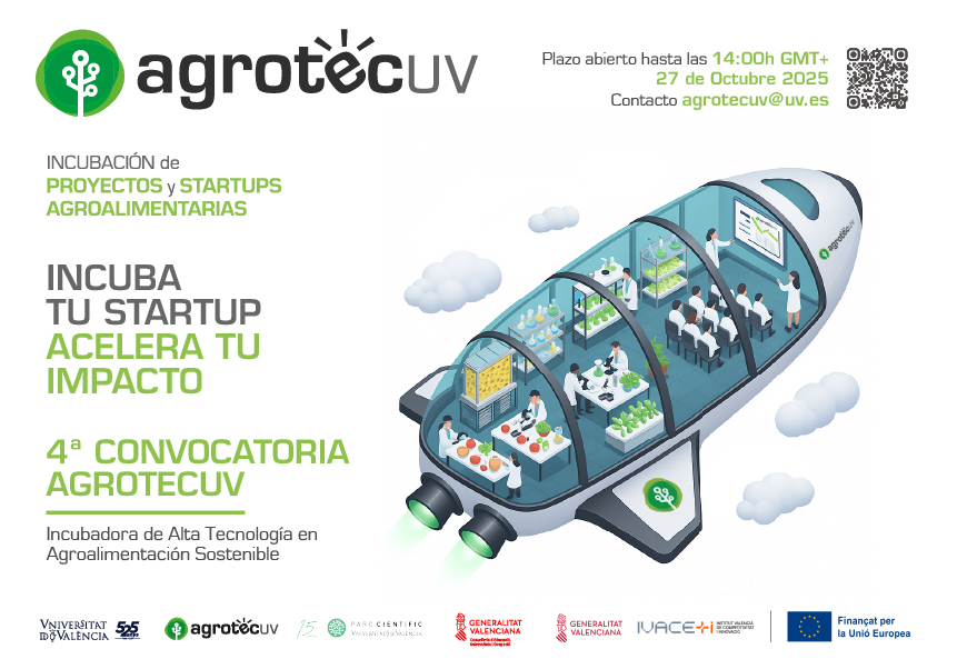 AgrotecUV is an initiative of the University of Valencia and the Fundació Parc Científic Universitat de València promoted by the INCyDE Foundation for the creation, implementation, dissemination and revitalization of a High Technology Incubator in Sustainable Agri-Food, hereinafter AgrotecUV. It is co-financed 50% by ERDF funds in the Multiregional Operational Program 2014-2020 within axis 3: Improving the Competitiveness of SMEs, Thematic Objective 3 Improving the competitiveness of small and medium-sized enterprises, and investment priority 3ª: Promoting entrepreneurship, in particular, facilitating the economic exploitation of new ideas, and promoting the creation of new companies, also through incubators.