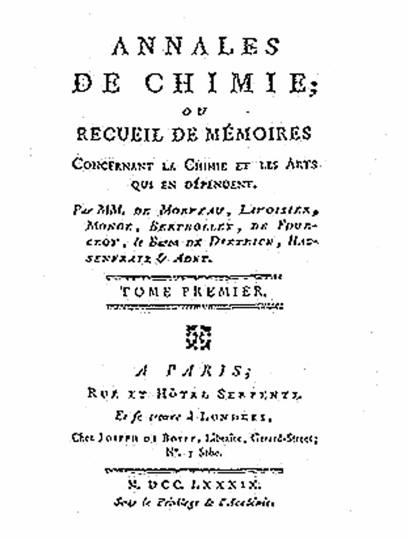 Portada del primer volumen de la revista "Annales de chimie"Fue una de las primeras revistas especializadas de química. Fue creada por Antoine Lavoisier y sus colaboradores en 1789.