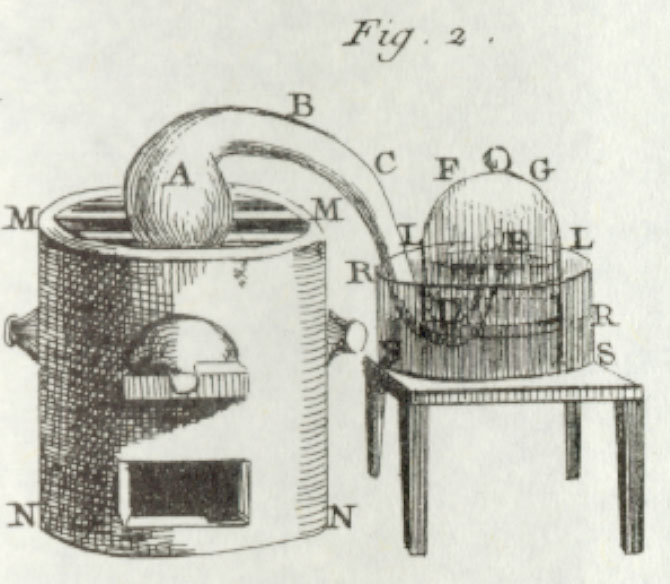 • El Traité élémentaire de chimie de Antoine Lavoisier (1743-1794), se publicó en París en 1789 y representa la culminación de la química del siglo XVIII que llevó al abandono de la teoría del flogisto y al uso de nuevas concepciones sobre los elementos y la composición de los cuerpos. El grabado de la exposición contiene numerosas referencias al estudio de los gases, entre ellas la reducción del óxido de mercurio a través del calor producido por una lupa, experiencia utilizada por Joseph Priestley para aislar el oxígeno en la campana de gases.
