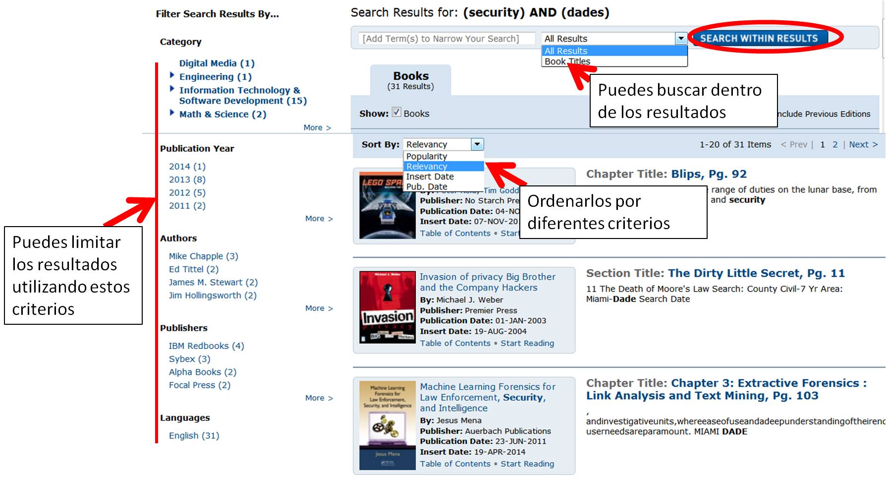 Se pueden ordenar los resultados de la búsqueda por distintos criterios, si los resultados incluyen "libros" y "short cuts" podrás limitar tu búsqueda a un solo tipo de documento o a ambos: