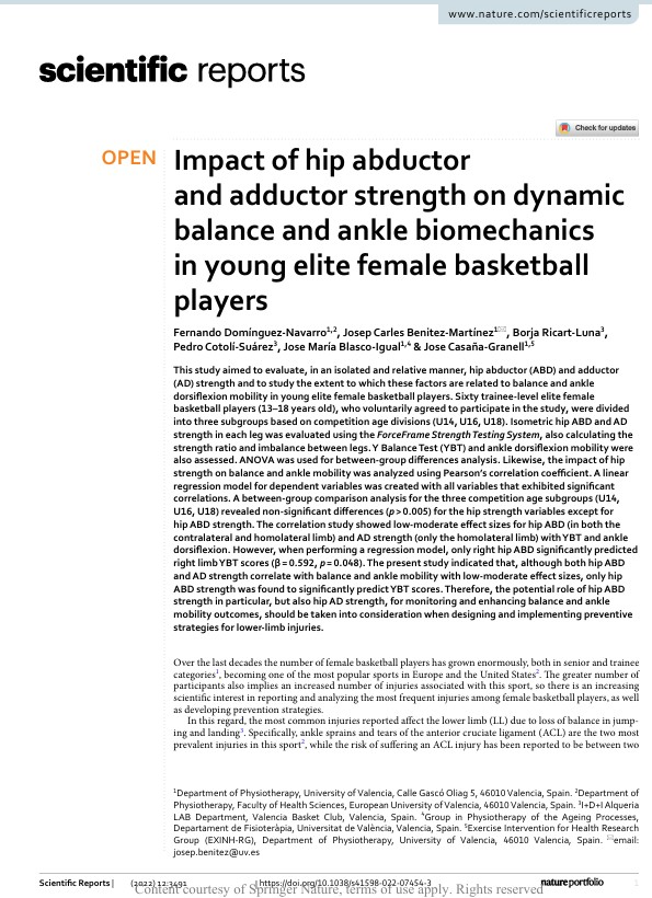 (2022). ArticleThis study aimed to evaluate, in an isolated and relative manner, hip abductor (ABD) and adductor (AD) strength and to study the extent to which these factors are related to balance and ankle dorsiflexion mobility in young elite female basketball players. Sixty trainee-level elite female basketball players (13–18 years old), who voluntarily agreed to participate in the study, were divided into three subgroups based on competition age divisions (U14, U16, U18). Isometric hip ABD and AD strength in each leg was evaluated using the ForceFrame Strength Testing System, also calculating the strength ratio and imbalance between legs. Y Balance Test (YBT) and ankle dorsiflexion mobility were also...