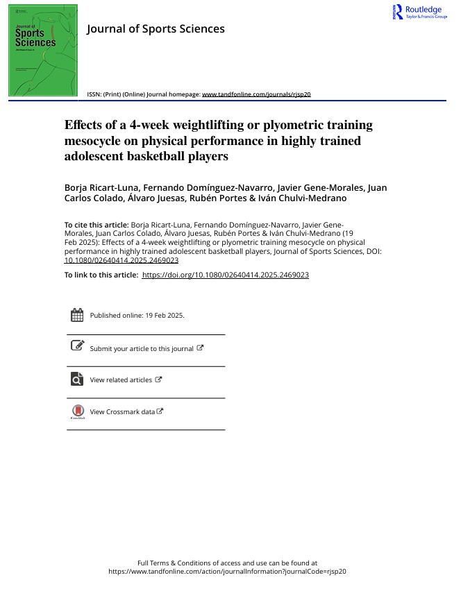 (2025). ArticleThis study examined the effects of weightlifting (WTG) and plyometric (PTG) training on ankle mobility, strength, power, and running performance in highly trained adolescent basketball players. Participants (male, n = 23; female, n = 35) were randomly assigned to WTG or PTG, training three times weekly for four weeks. Assessments included ankle dorsiflexion, hip strength (ABD-ADD ratio and asymmetry), handgrip strength, lower limb power (Counter Movement Jump -CMJ- and Broad Jump), and running performance. Both interventions significantly improved ankle dorsiflexion (left: p < .001, d = 1.10; right: p < .001, d = 1.50) and hip strength (left adduction: p = .001, d = 0.93; right abduction:...