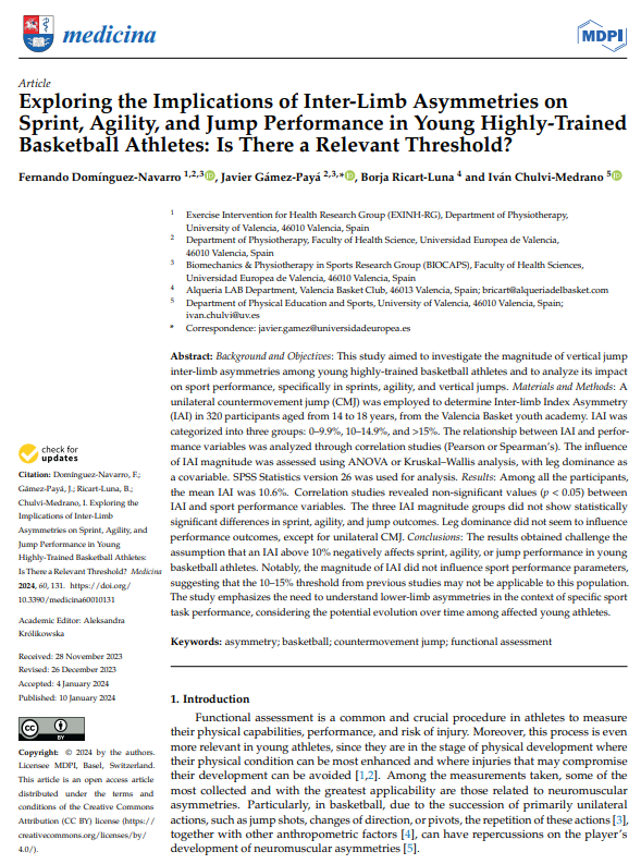(2024). ArticleBackground and Objectives: This study aimed to investigate the magnitude of vertical jump inter-limb asymmetries among young highly-trained basketball athletes and to analyze its impact on sport performance, specifically in sprints, agility, and vertical jumps. Materials and Methods: A unilateral countermovement jump (CMJ) was employed to determine Inter-limb Index Asymmetry (IAI) in 320 participants aged from 14 to 18 years, from the Valencia Basket youth academy. IAI was categorized into three groups: 0–9.9%, 10–14.9%, and >15%. The relationship between IAI and performance variables was analyzed through correlation studies (Pearson or Spearman’s). The influence of IAI magnitude was...