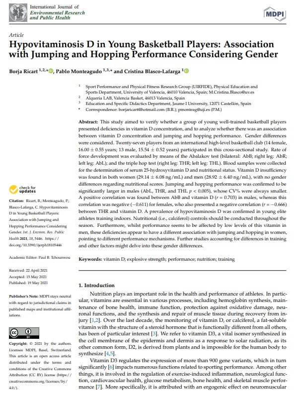 This study aimed to verify whether a group of young well-trained basketball players presented deficiencies in vitamin D concentration, and to analyze whether there was an association between vitamin D concentration and jumping and hopping performance. Gender differences were considered. Twenty-seven players from an international high-level basketball club (14 female, $16.00 \pm 0.55$ years; 13 male, $15.54 \pm 0.52$ years) participated in this cross-sectional study. Rate of force development was evaluated by means of the Abalakov test (bilateral: AbB; right leg: AbR; left leg: AbL); and the triple hop test (right leg: THR; left leg: THL). Blood samples were collected for the determination...