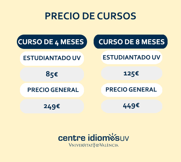 A través del aula virtual de la Universitat de València accederás a los materiales del curso en la plataforma online LlenguaLab organizada por unidades teórico-prácticas. El tutor del curso, además de hacer un seguimiento de tu aprendizaje y corregir los ejercicios de la plataforma, te asignará otras actividades siguiendo los modelos de las pruebas de acreditación y resolverá tus dudas. Además, cada semana contarás con dos clases tele presenciales de 50 minutos  a cargo de un profesor de nuestro centro para acompañar a cada unidad de la plataforma online.