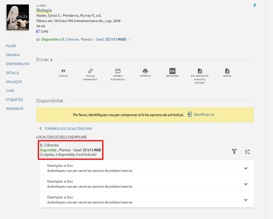 Mader, S. y Pendarvis, M. Biología.México, McGraw-Hill, 2008, ¿cuántos ejemplares hay disponibles en préstamo de este libro en la Biblioteca de Ciencias? ¿en qué salas lo puedes encontrar?