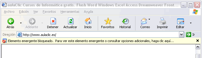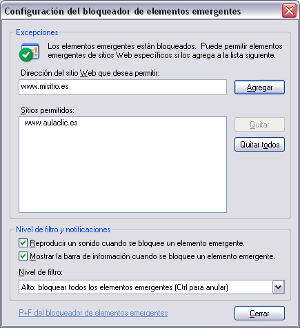 Sobre los niveles de filtro podríamos decir que los niveles Medio y Bajo permiten en mayor o menor medida el uso de pop-ups por el navegador. El nivel Alto bloquea sistemáticamente todas las ventanas emergentes, pero permite la opción de apertura de éstas manteniendo la tecla Ctrl pulsada mientras haces clic en el vínculo (link) que abre el pop-up.